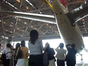 いくつかの予備知識をインプットした後は、整備格納庫に移動。広い格納庫では、たくさんの整備士が忙しく働く姿を目の当たりにしました。その多くは20代から30代の男性。整備は、24時間体制でエアコンも無い場所での厳しい作業なので、現場ではベテランに交じって若手も活躍しているようです。1機当たりに関わる整備士の人数は、一日になんと150人。