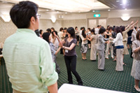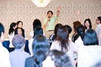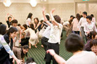 その後は、2重のサークルになって行うワーク、言葉を使わずに動きだけで表現するワーク、ほかの参加者とともにグループを作って行うワークなどなど、さまざまなワークが大いに盛り上がりながら、テンポよく進行していきました。途中で飛び入りした人も、すぐに会場の雰囲気に溶け込み、楽しそうに身体を動かしています。そしてあっという間に今日のまとめの時間。ひとつひとつの感覚で行っていたワークが、頭の中で整理されていきます。気が付いたら、和気あいあいと楽しく、そして知らず知らずのうちに多様なコミュニケーションの方法やコミュニケーションの真髄を学んでいました。