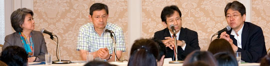 会場からは「コミュニケーションとして伝えるということが苦手な日本人が、世界に出て行くしかない、となった中で、どのように企業がリーダーシップを発揮できるか」「その中で、教育問題をどのように考えるか」、また「企業のCSR活動」についても、質問がおよびました。鈴木さんの「教育問題に取組む想い」が改めて伝えられ、末吉さんは「病気の社会からは良いビジネスはうまれない」と語られ、企業が目指すべき取り組みについて学びました。