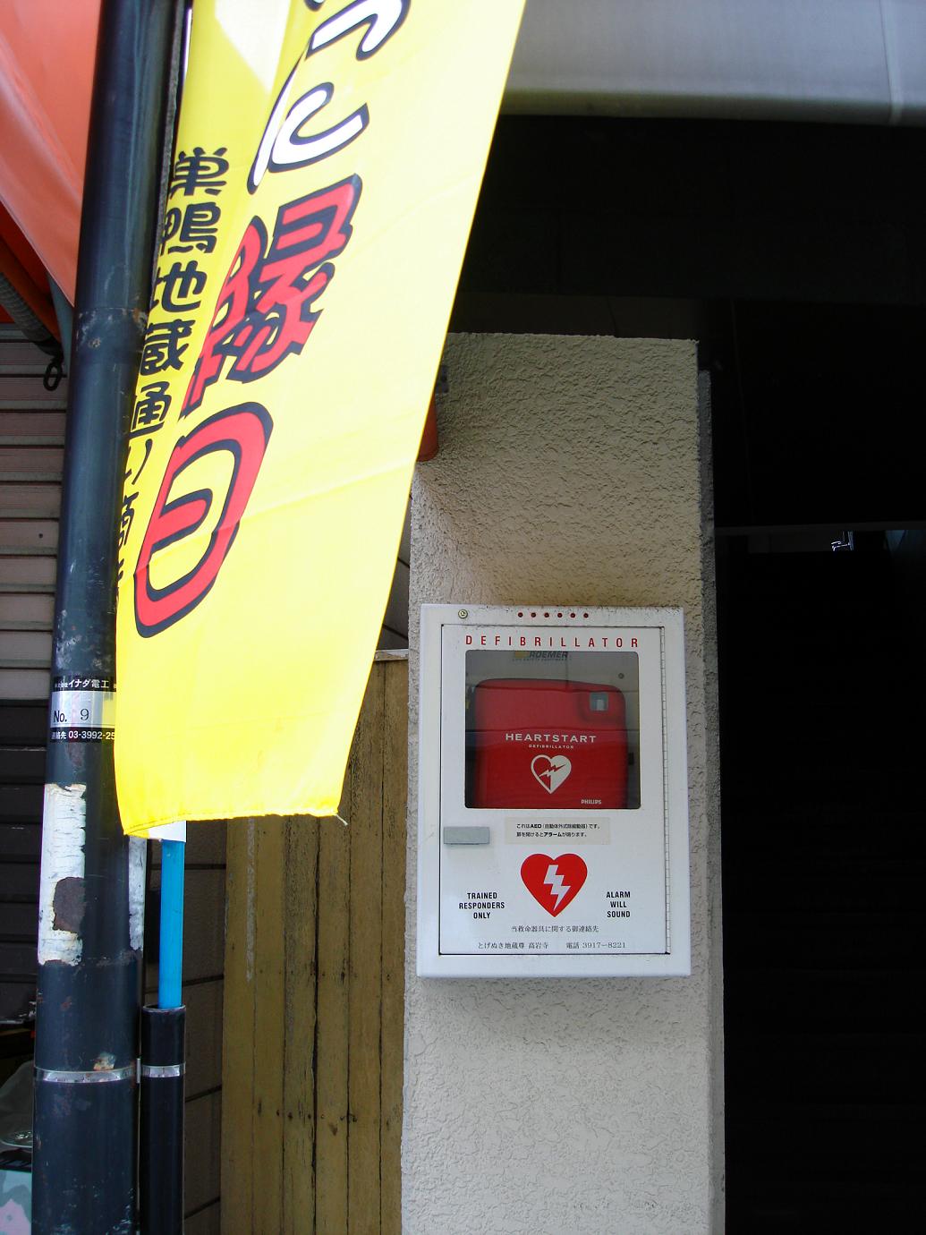 巣鴨のとげ抜き地蔵通り商店街で見かけたAED※です。お年寄りの多く集まる街、さすが、と感心しました。機械の出番がないのが一番ですが、もしもの時にはこれで誰かの命が助かることを祈ります。 ※AEDとは、死に至るような危険な不整脈の状態を、電気ショックを与えて元に戻せるものです。一般の方でも使用が認められたので、病院はもちろん、駅や空港、学校などでも見かけるようになりました。救急車を呼び、来るまでの初期救命に使います。機械が音声で使い方を教えてくれるので、初めての人でも落ち着いて使えば大丈夫です。講習会もあちこちで開かれています。私も以前、受けました。