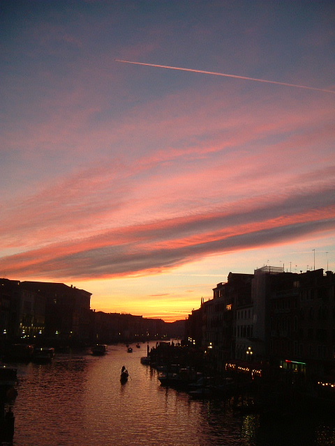 まるで魔法で時が止まったように、美術館の中の500年前の絵とまるで同じヴェネチアの町並み。暮れなずむ運河に浮かぶゴンドラのシルエットに見惚れていると、ヴェネチアングラス色に染まる空をひと筋の飛行機雲が……。