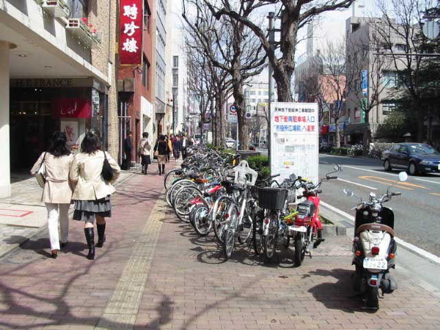 福岡市天神地区は13年度の放置自転車全国ワースト1になってしまい、「チャリ・エンジェルズ」という放置自転車対策の広報隊を作り、街中には自転車を止めると指導する係を置くなどし、日々、汚名返上に努力しているようです。しかし、係員がいないところでは相変わらずの状態です。駐輪場も増やし、料金は3時間まで無料にするなどの対策の効果もまだまだなようです。