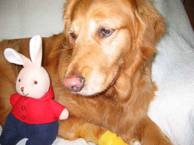 サクラというゴールデンレトリーバーです。7歳の時に脚に腫瘍ができ切除の上手な先生に助けていただき、9歳を迎える事ができました。その時から彼女の食事には生肉、生野菜にヨーグルトとアガリクスが加わりました。わたしの気持ちが落ち込んだ時は彼女にもストレスが行くような気がします。眠りたい時のお友だちがぬいぐるみのようです。