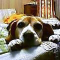 わが家の愛娘・チャッピー(ビーグル)です。わたしたち夫婦が結婚した年の、99年3月25日生まれの5歳です。子犬の頃は病気がちで、1歳になるまでに3回の手術を受けました。この先どうなるかと心配した時もありましたが、今ではすっかりオテンバ娘になりました。とっても甘えん坊で、写真は実家の母のひざの上にチョコンと座る姿を撮りました。