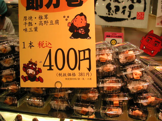 節分フィーバー大阪地方の今日は節分フィーバーです。例年と比べてどうなのかは解りませんが、不景気だとその分縁起担ぎは多くなるのかもしれませんが。どこに行っても今日の大阪は巻き寿司といわしの丸焼きです。特に巻き寿司は今年の恵方に向かって無言で食べなくてはいけないようです。今年は東北東が恵方だそうです。百貨店のおすし屋さんコーナーにてごく一部ですが。 撮影場所: 大阪 撮影日時: 2004/02/03 投稿日時: 2004/02/03 撮影者: カルメン・ミッキー