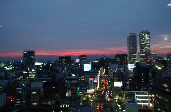 ビルの最上階からみた夕焼けです。地平線が鮮やかな赤色に染まっていてきれい。