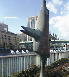 橋の欄干。向こうの方まで、よーく見てみてください。鳥がずらりと並んでます。攻撃されそうで、ちょっとコワイです。でも、ついつい横を通ってしまいます。