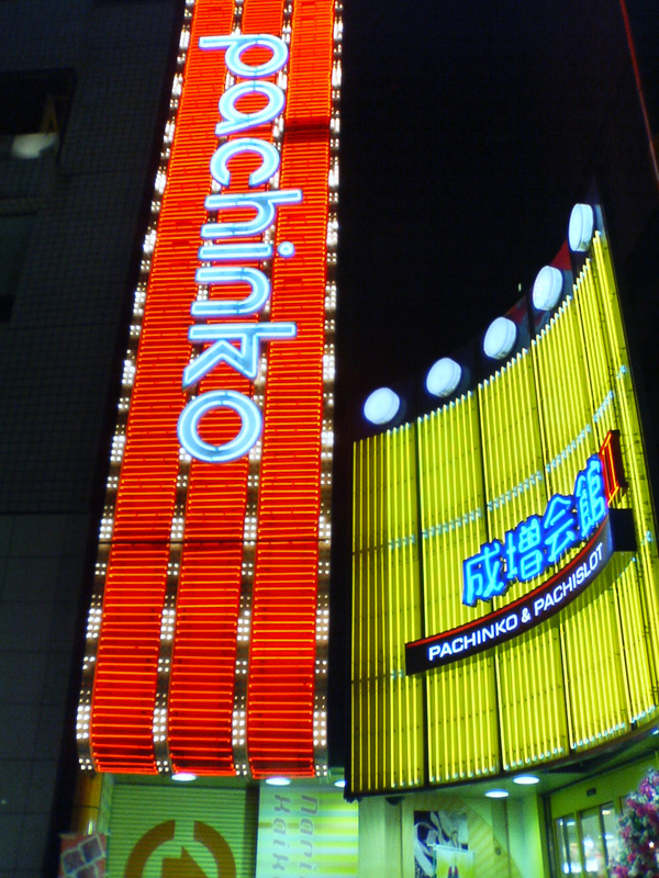 東京、日本の娯楽で有名な「パチンコ」。朝から夜まで輝くネオンがきれいです。夜遅くに帰ってもネオンが迎えてくれます。地元のパチンコ屋さんにて。