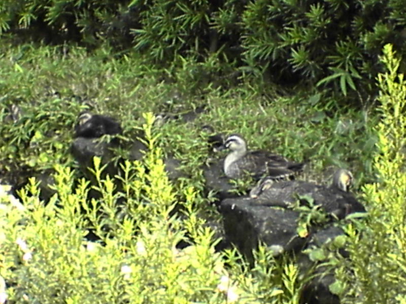 先日リポートを送った、世田谷区池尻の、カルガモ親子の今日の姿です。お昼寝なのか、みな岸に上がって休んでいました。母ガモが、見慣れぬ人が来ると、すぐに首を伸ばして辺りを警戒しているのには、ちょっと感動しました。池尻大橋の隣の駅の渋谷駅では、朝に発砲事件があったばかりでしたが、こちらは平和でした。