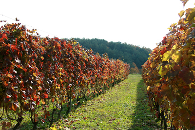 ▲晩秋のブドウ畑。シャルドネ種は黄葉、メルローは紅葉となります