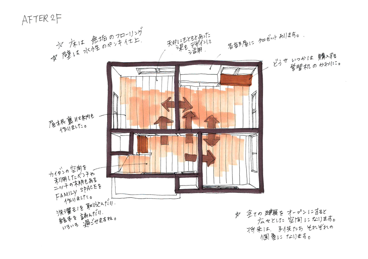 さて、本日は「子どもと暮らす間取り」についてお話しますね。「子ども」と言っても年代によって、また教育観によってもご提案する間取りは異なります。今日は実際のリフォーム例を元に、お伝えしたいと思います。